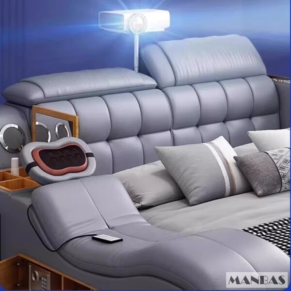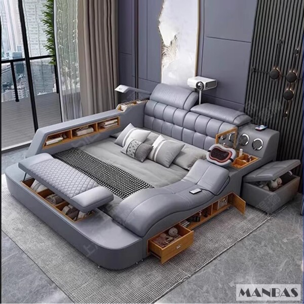 Ervaar ultieme ontspanning met deze luxe kingsize echte lederen slimme bed, ontworpen om van uw slaapkamer een moderne retraite te maken. Met een echt lederen oppervlak en een duurzame houten structuur combineert dit multifunctionele bed stijl en intelligente technologie. Het bevat een ingebouwd massagesysteem, Bluetooth-audio, USB-poorten, projectorruimte, laptoptafel, dressoirboxen, boekenplanken en verborgen opslagcompartimenten. Ideaal voor slim leven, het ondersteunt ook technische integraties en minimalistisch gemak. Beschikbaar in maten van 1500 mm tot 1900 mm, past het bij verschillende slaapkamerafmetingen met een zacht, gestoffeerd ontwerp. Dit bed vereist montage en is vervaardigd met een moderne esthetiek die moeiteloos past in high-end interieurs. Als u uw ruimte in Amsterdam, Rotterdam, Den Haag, Utrecht, Eindhoven, dit slimme bed opnieuw definieert, herdefines comfort en veelzijdigheid in huis.